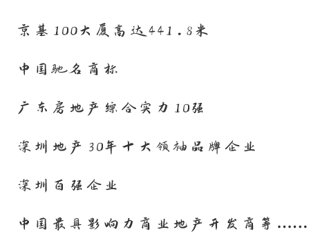 秉承“責(zé)任筑基,創(chuàng)新為魂”的企業(yè)核心價值觀,京基集團(tuán)敢為人先,追求卓越,創(chuàng)造了一系列獨(dú)特性的成果和經(jīng)驗(yàn),以強(qiáng)大的品牌影響力和產(chǎn)品力,于2012年被認(rèn)定為中國馳名商標(biāo),并分別獲得:中國房地產(chǎn)企業(yè)50強(qiáng)金球獎、最具綜合競爭力品牌價值企業(yè)、“中國典型房企銷售金額排行榜”TOP100、廣東房地產(chǎn)綜合實(shí)力10強(qiáng)、深圳市房地產(chǎn)開發(fā)行業(yè)綜合實(shí)力十強(qiáng)暨行業(yè)領(lǐng)軍企業(yè)、粵港澳大灣區(qū)金牌競爭力獎、中國最具影響力商業(yè)地產(chǎn)開發(fā)商等多項榮譽(yù)稱號。