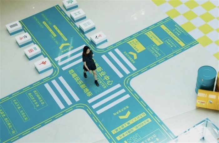 位于陽光新業(yè)中心一樓中庭的美陳打卡點,霓虹燈、油漆桶、網紅鐵藝網、治愈十字斑馬線、巨型麻將墩子...復古與新潮元素相碰撞,寶石藍與明黃搭配亮眼,并融入“潮玩體驗站”“夜經濟發(fā)聲地”等多重互動場景,兼具九眼橋片區(qū)夜經濟特色和購物中心自身鮮明特點,形成了以“交個新朋友”為主題的社交空間,同時將承載精彩紛呈的營銷活動。